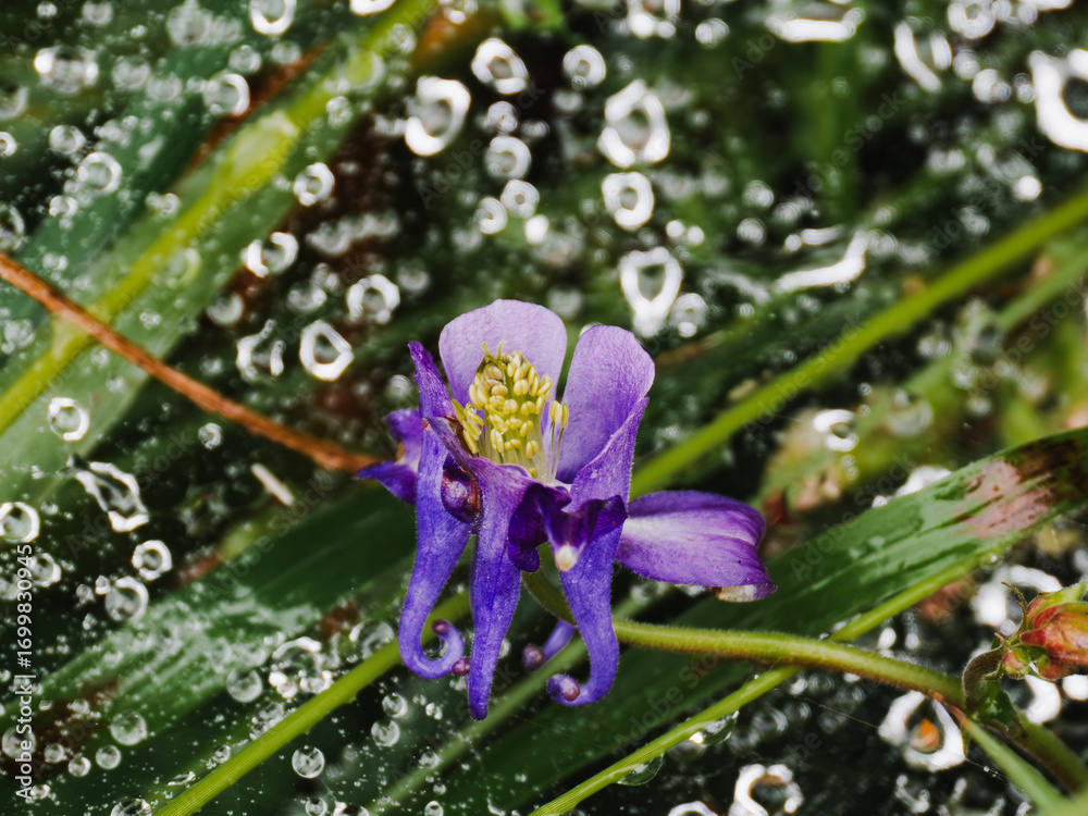 Purple water flower surrounded by droplets on green leaves in a wetland area during a rainy day