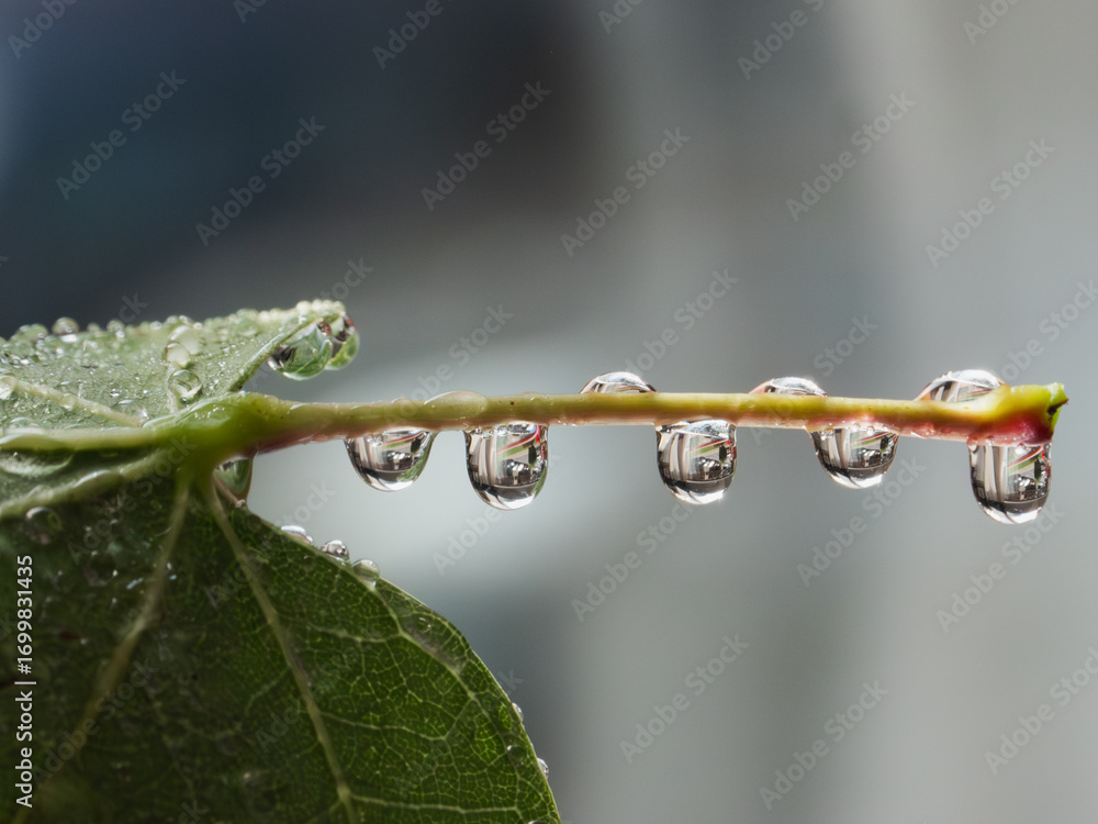 Droplets of water cling to a green leaf in a close-up shot capturing nature’s details in a subtle and serene atmosphere