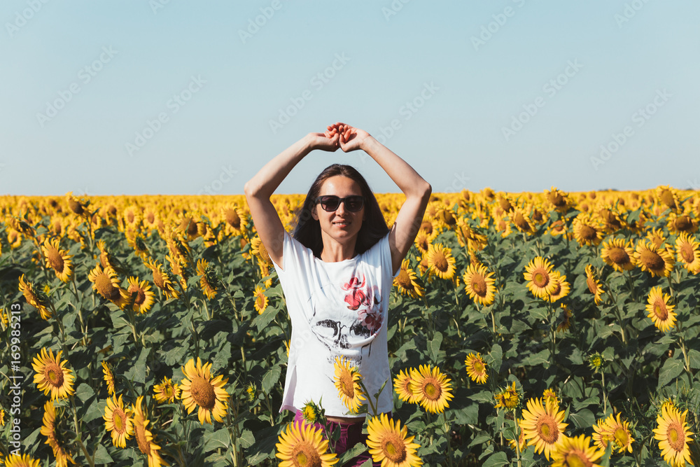 Young Beautiful Girl Standing In Sunflowers And Raising Hands Up. Freedom Lifestyle Journey Concept