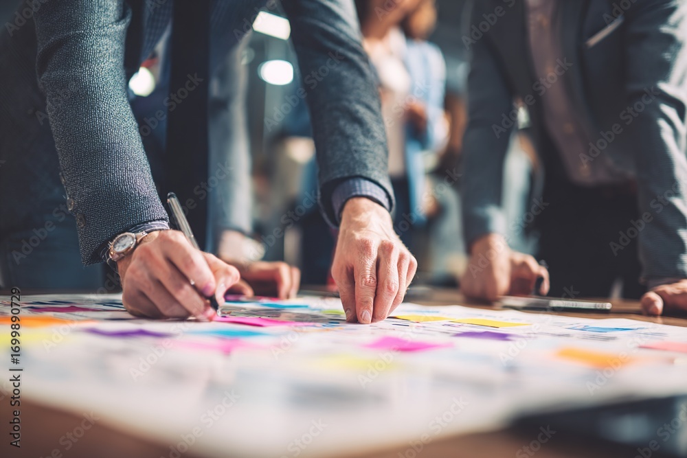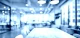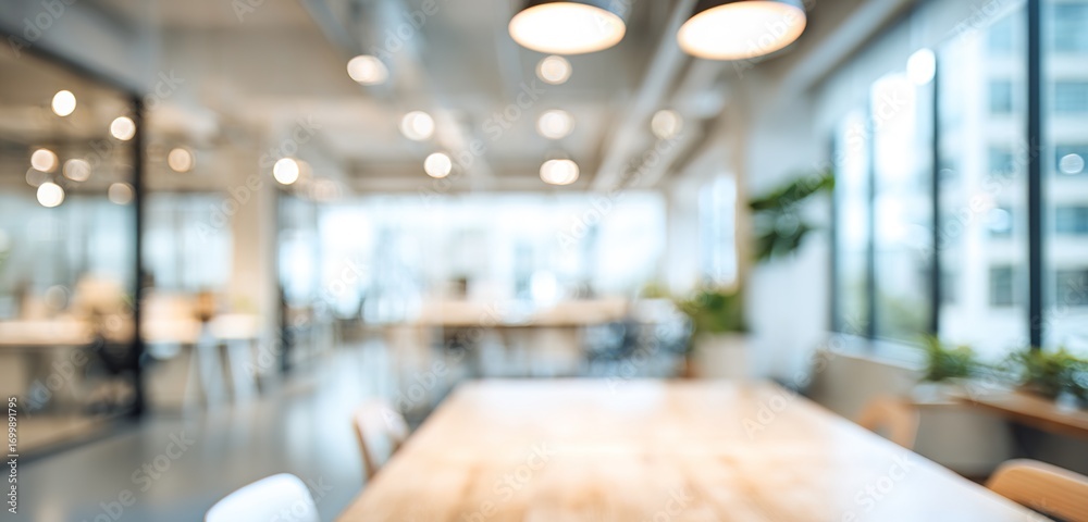 Bright and spacious office space in an unfocused view. Modern blurred background photo for banner, poster or magazine and website background. High quality