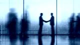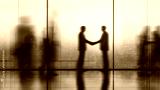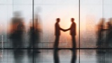 Business agreement concept showing blurred silhouette of business people shaking hands near large window in office building showing blurry cityscape. High quality