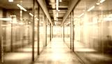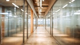 Blurred office hallway with glass walls and neutral colors creates a sense of space. Professional photos for backgrounds for text, banners, posters, and web displays. High quality