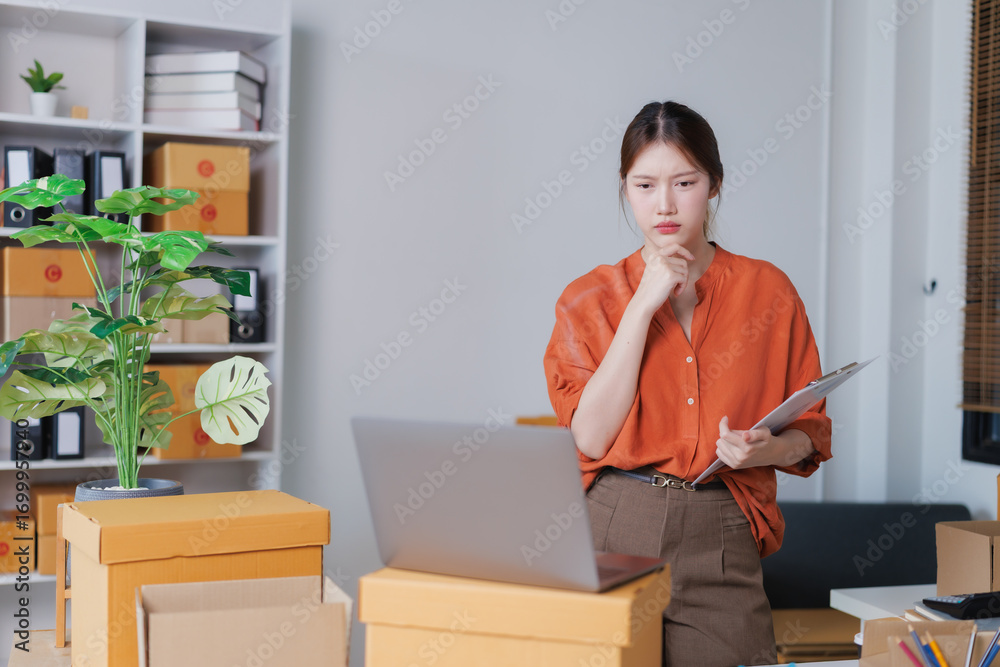 Young asian entrepreneur woman holding clipboard and looking at laptop while thinking about her startup business plan in office, sme business online shopping working at home concept