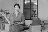 Young entrepreneur smiling and holding tablet and stylus, managing her online store in her office or warehouse, surrounded by cardboard boxes, startup and online business concept