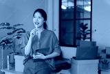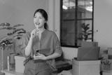 Young Asian businesswoman is holding tablet and thinking about new office organization while sitting on desk with cardboard boxes and laptop in background