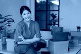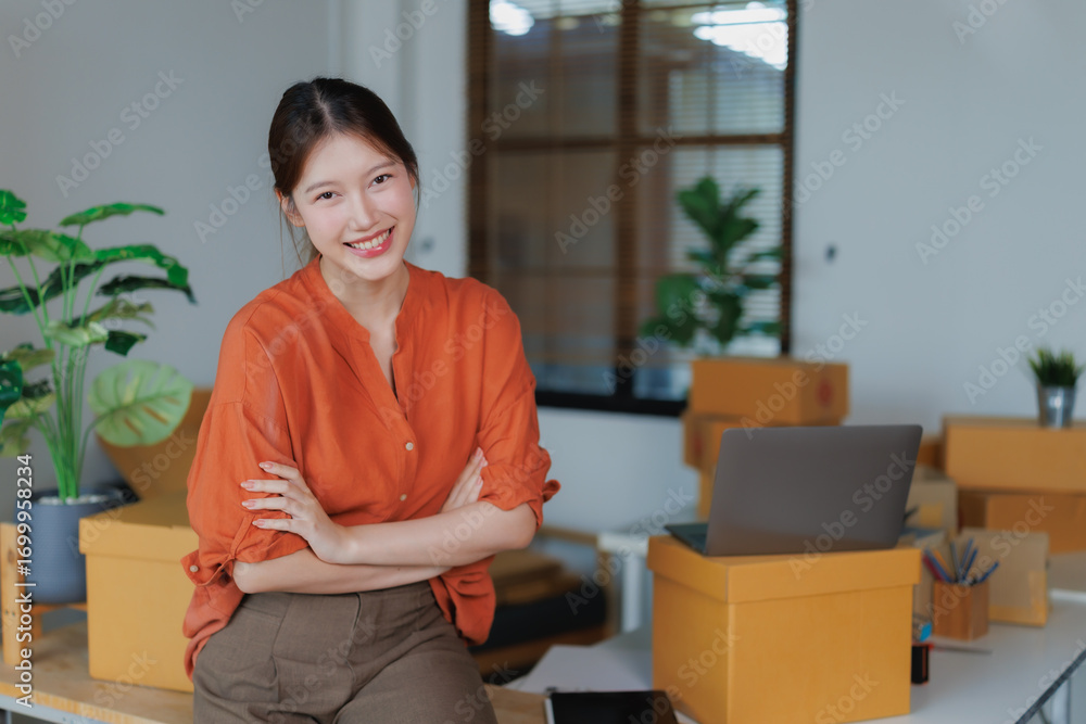 Smiling young Asian businesswoman sitting at a table in her startup office, surrounded by cardboard boxes and a laptop, embodies online retail and entrepreneurship