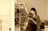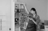 Young asian woman wearing apron raising her fist while looking at mobile phone and celebrating success in startup office, small business owner working at home office selling online on a website