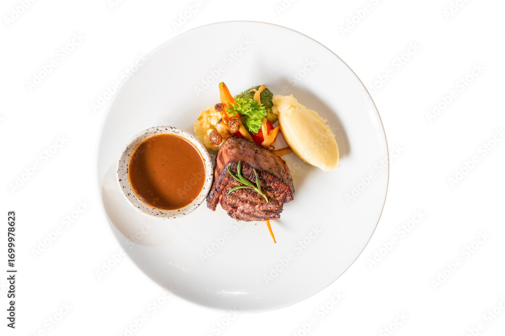 Gourmet Cuisine: A top-down perspective of a gourmet meal artfully presented on a pristine plate, showcasing succulent steak, vibrant vegetables, and delectable sauce, evoking culinary pleasure.