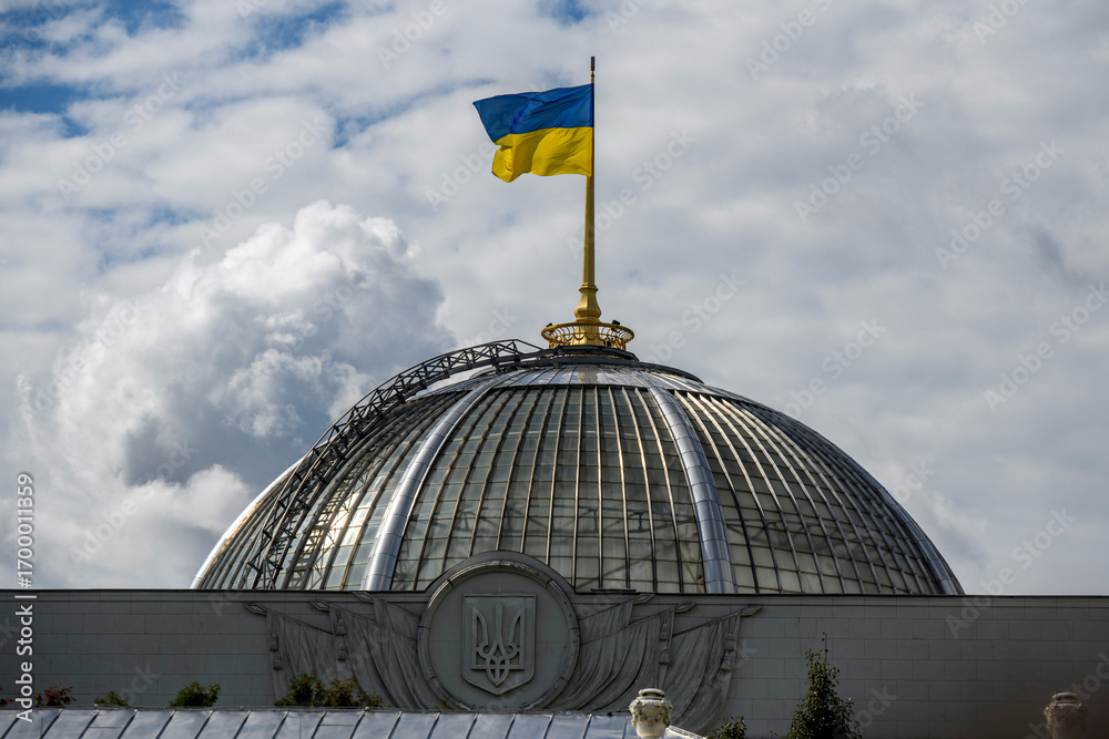 The Ukrainian flag flies above the dome of the parliament building on Ukraine's Independence Day in Kyiv, Ukraine, August 24, 2025