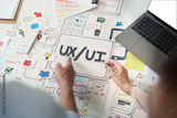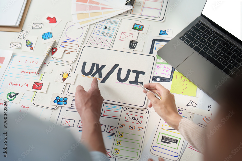 UXUI design brainstorming session with sketches and digital tools