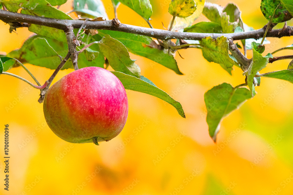 red apple hanging on the branch with leaf. ripe organic fruit on the tree. rural autumn harvest in the orchard