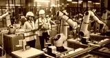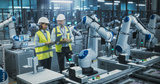 Caucasian Engineers Standing in an Industrial Facility, Using Laptop Computer at an Electronics Factory. Female and Male Specialists Chatting, Monitoring Assembly Robots on a Modern Production Line