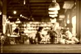 Empty wooden table space platform and blurry defocused restaurant interior, Vintage tone