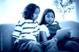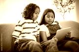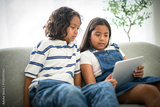 two 9 years thailand twin sit on sofa at home with tablet