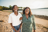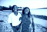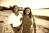 Cheerful black american mother and her daughter on beautiful seascape