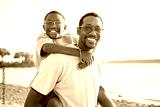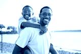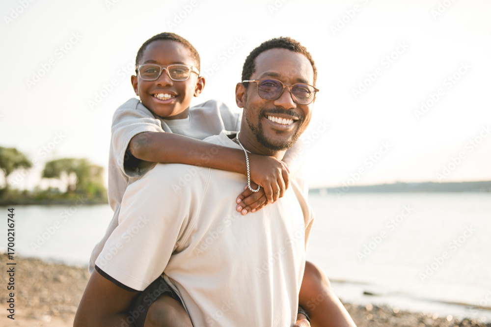 Cheerful black american father and is son against beautiful seascape