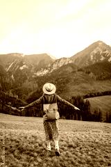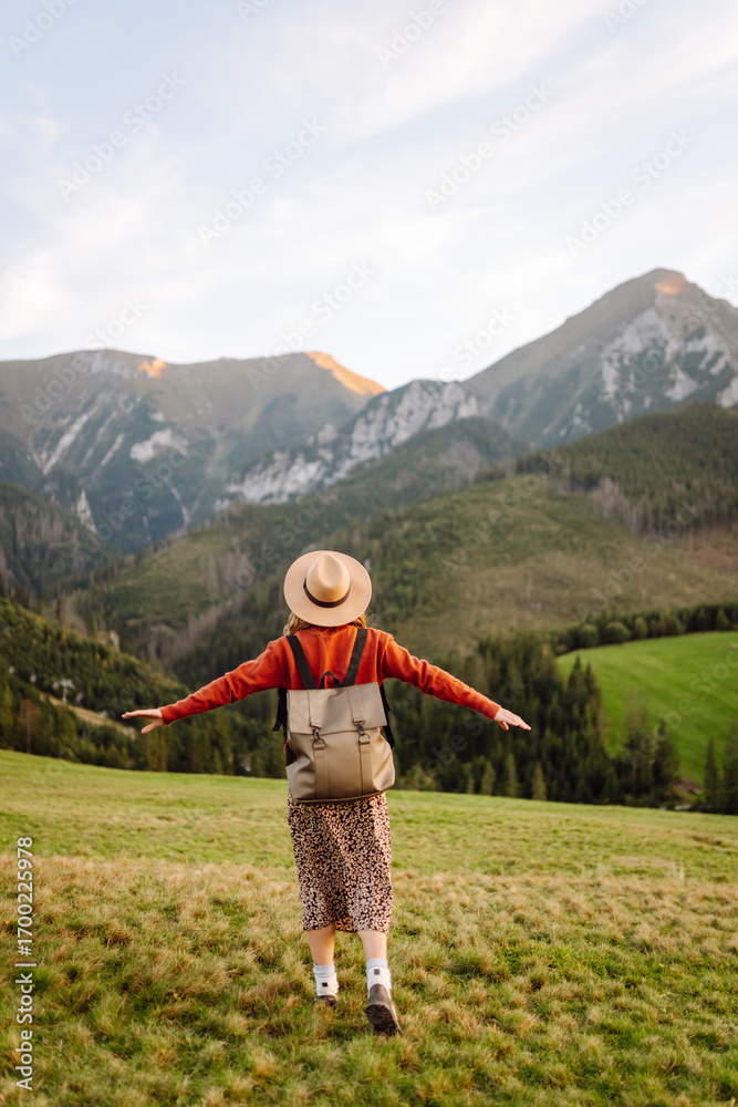 A female traveler with a backpack and a hat enjoys a green mountain landscape. A young woman walks along the tops of the hills. The concept of nature and adventure, hiking. Active lifestyle.