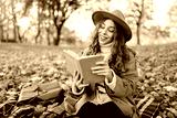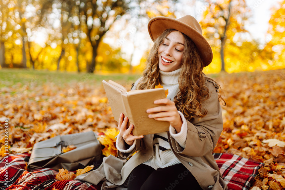 A cute woman in hat sits on soft blanket with book in autumn park. Beautiful woman relaxes in sunny forest, sits on meadow surrounded by yellow leaves, enjoys nature. Concept of rest and relaxation.