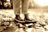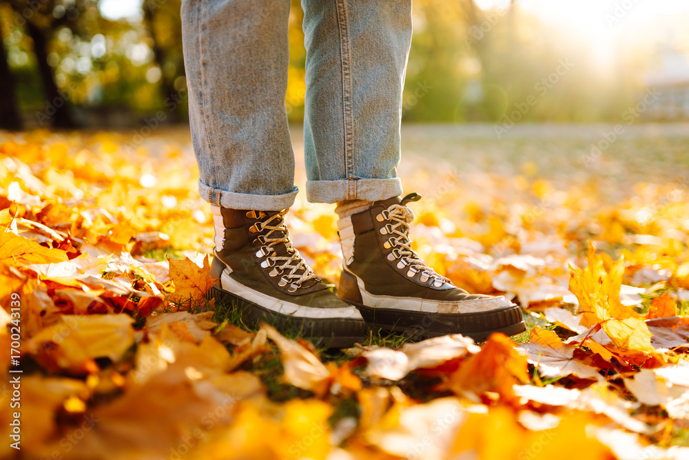 A close-up of a woman's feet in hiking boots walking through bright foliage in a sunny forest. A female hiker walking along a hiking trail in boots at sunset. Concept of adventure, seasonality.