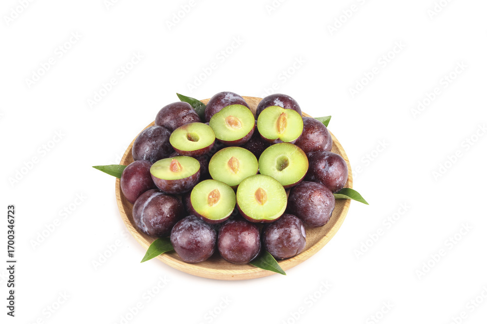 Fresh Sweet Plums in Wooden Bowl - Ripe Purple Fruit with Green Leaves Isolated on White Background