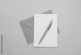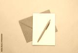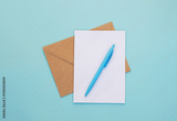 Blank note with kraft envelope and blue pen on blue background. Copy space.
