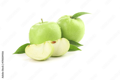 Fresh Green Apples with Water Droplets and Slice Isolated on White Background