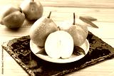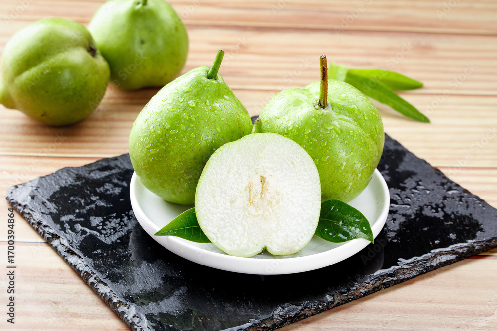 Fresh Green Pears from Shaanxi Province China - Whole and Sliced Fruit Display on Slate Board