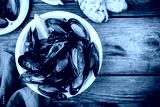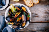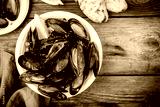 Delicious seafood mussels with with sauce and parsley. Lemon and baguette . Clams in the shells.