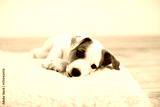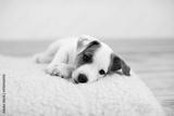 Puppy lies in a white bed under a blanket