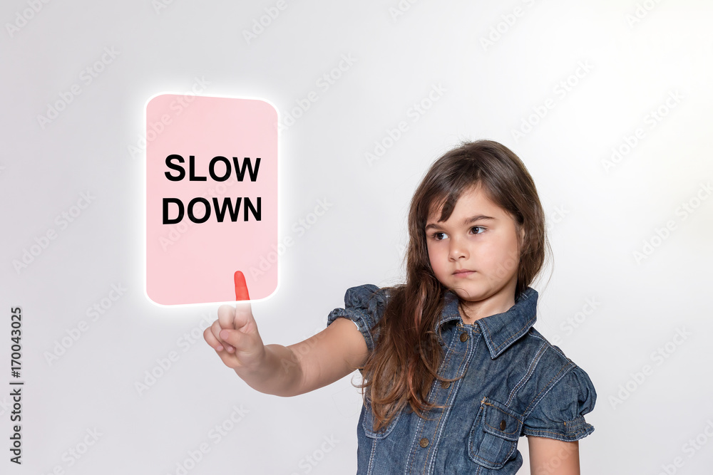 Little girl with is touching a transparent rectangle with inscription Slow Down