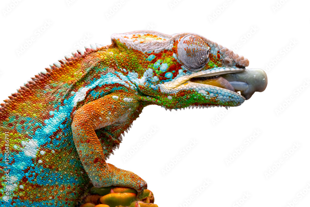 Panther Chameleon (Furcifer pardalis), Ambilobe morph, preparing to strike with its sticky ball-shaped tongue. This colorful reptile is native to Madagascar.