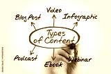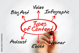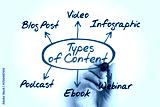 Diagram of Types of Content with arrows pointing to blog post, video, infographic, webinar, ebook, and podcast, showing digital marketing concepts on a clean background