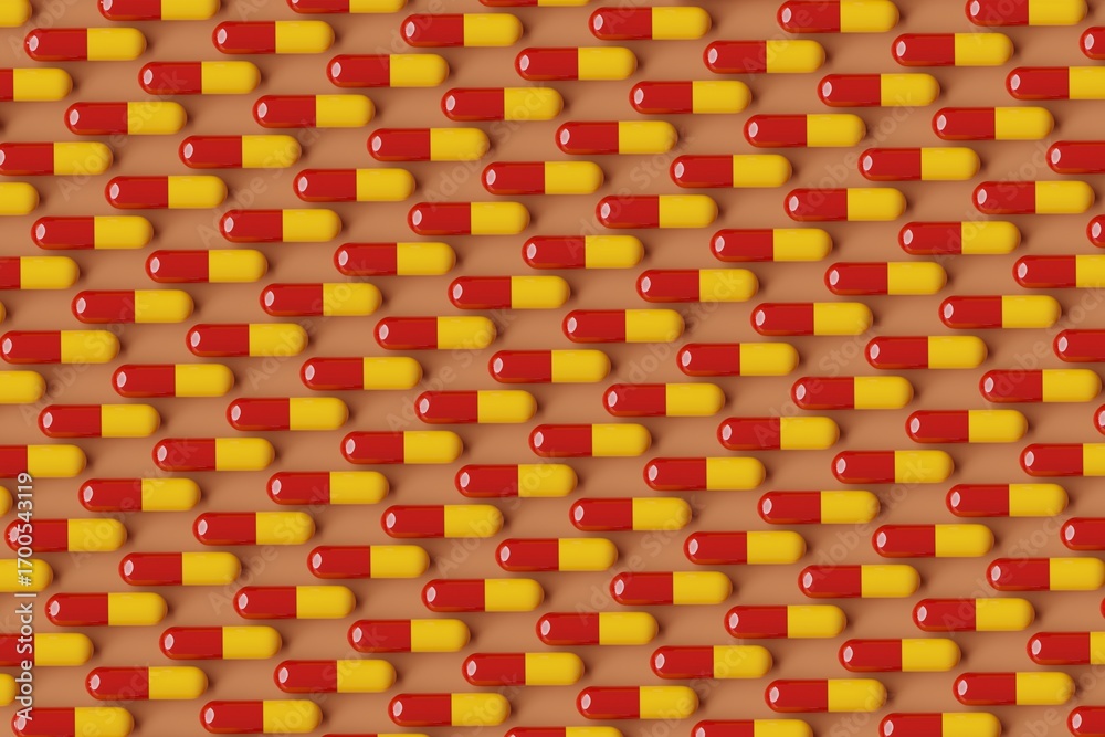 Many red and yellow pills on sienna background. Top flat view, diagonal grid. 3d render, illustration