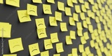 Many yellow stickers on black board background with sad smile symbol drawn on them. Closeup view with narrow depth of field and selective focus. 3d render, Illustration