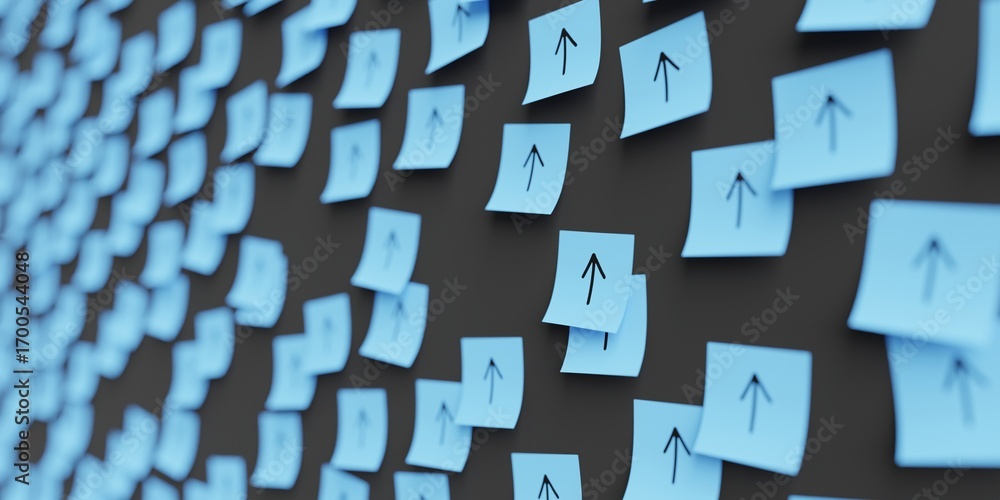Many blue stickers on black board background with arrow pointing up symbol drawn on them. Closeup view with narrow depth of field and selective focus. 3d render, Illustration