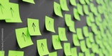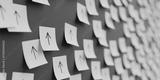 Many green stickers on black board background with arrow pointing up symbol drawn on them. Closeup view with narrow depth of field and selective focus. 3d render, Illustration