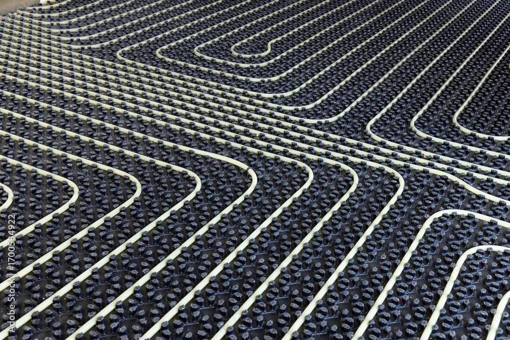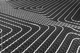 Plastic pipes for underfloor heating system installed over black insulation sheets in a new building