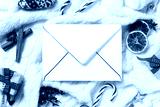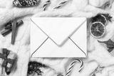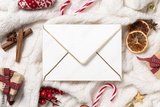 Envelope on white knitted sweater near red Christmas decor and dried fruits, mockup