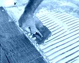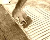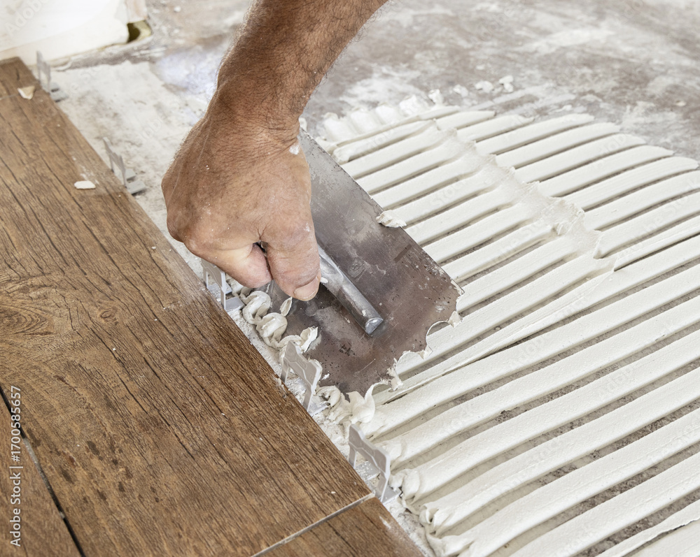 Craftsman spreads tile adhesive with trowel over a house floor, hand closeup. Construction process