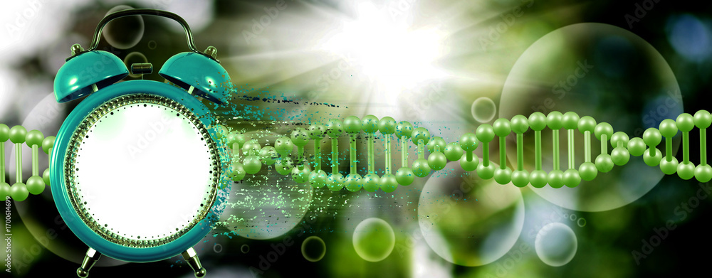 Green alarm clock merges with DNA strands under sunlight showcasing the passage of time and the essence of life