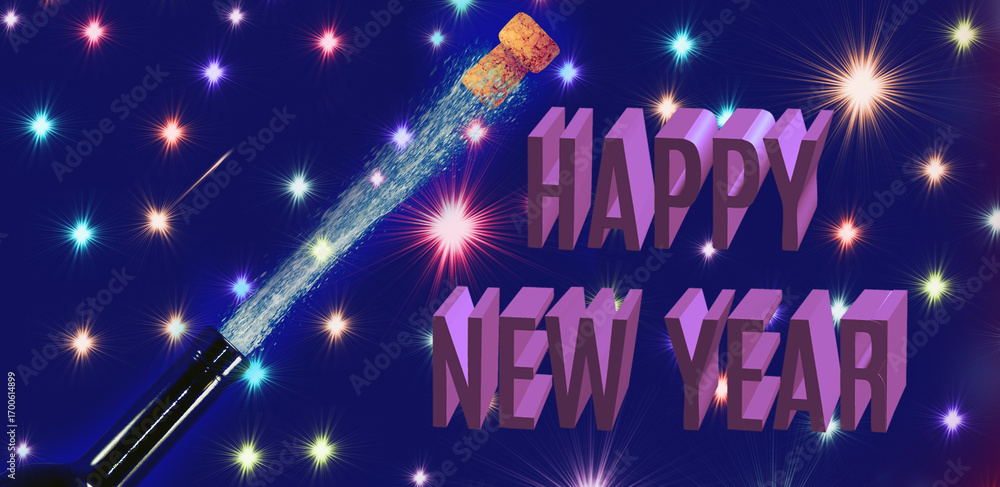 Festive bottle popping celebration ringing in the New Year with sparkling fireworks and joyous wishes for 2023 ahead