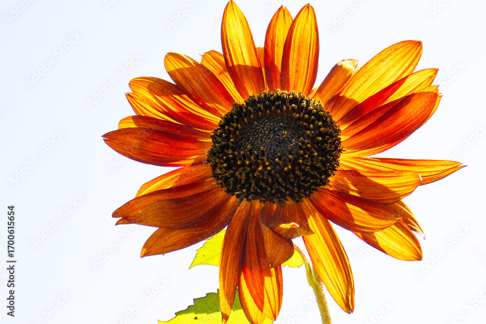 Vibrant sunflower blooms in brilliant hues of orange and yellow under the clear, sunlit sky