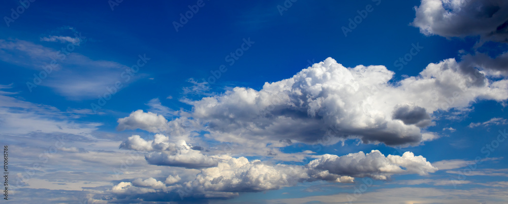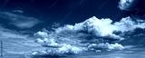 Majestic clouds dance across the azure sky at twilight, creating a serene panorama of nature's beauty