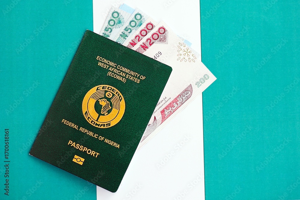 Nigerian naira currency money bills and passport lies on flag. The concept of travel and vacation