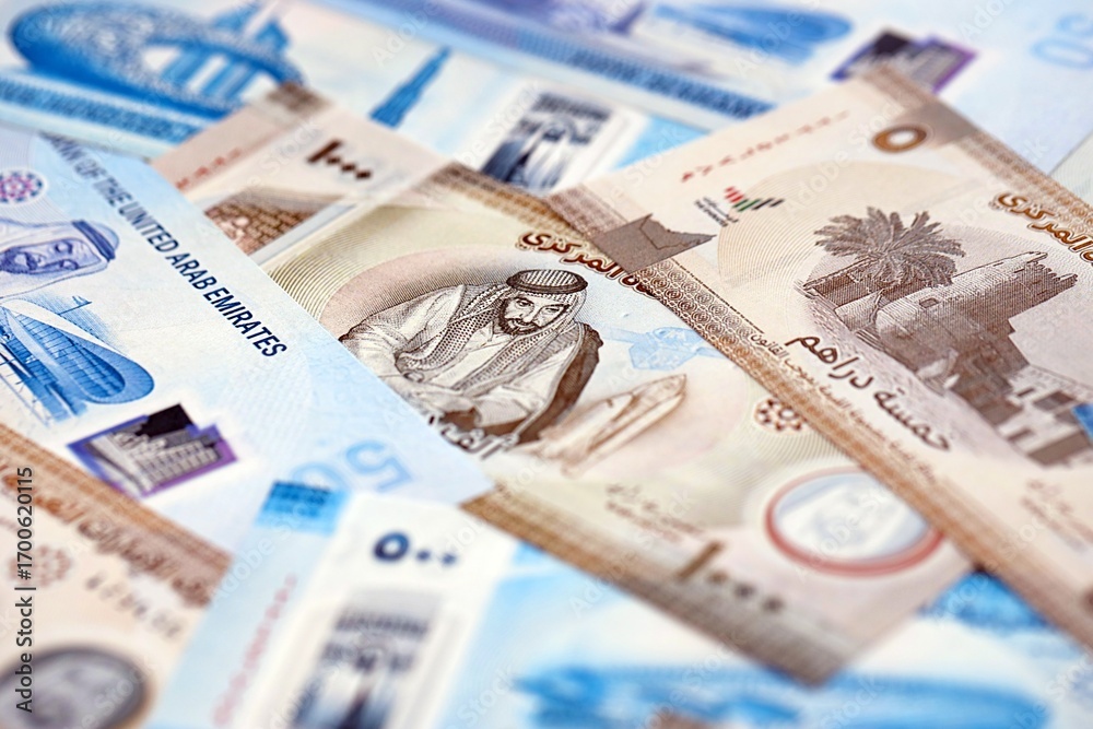 United Arab Emirates dirham currency money bills. The current banknotes lies on table in big amount