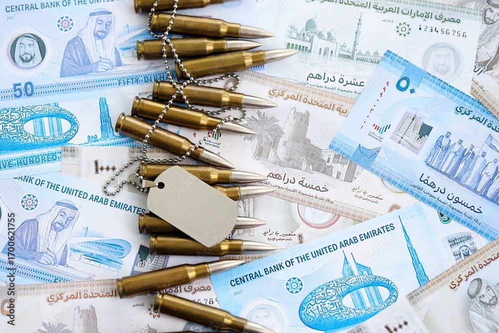 United Arab Emirates dirham currency money bills and rifle bullets with dogtag. The concept of warfare and army service