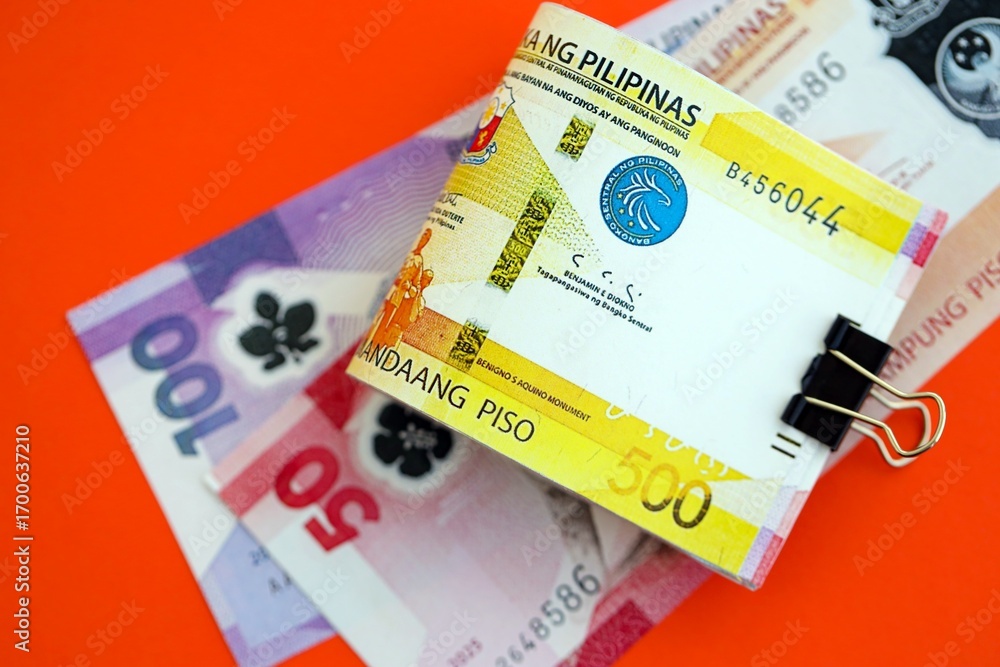 Philippines peso money bills in big amount on red. Finance and banking concept