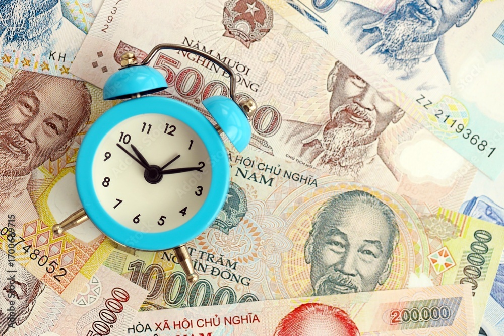 Vietnamese dong currency money bills and alarm clock. The concept of time management and income
