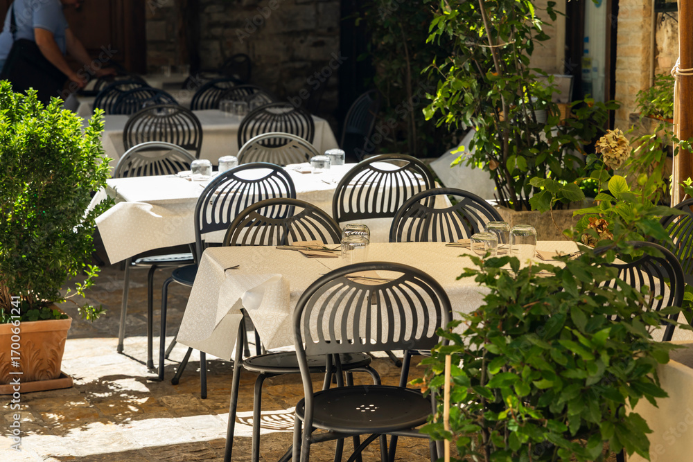 Outdoor restaurant tables with white tablecloths and black chairs in Assisi, Italy