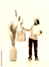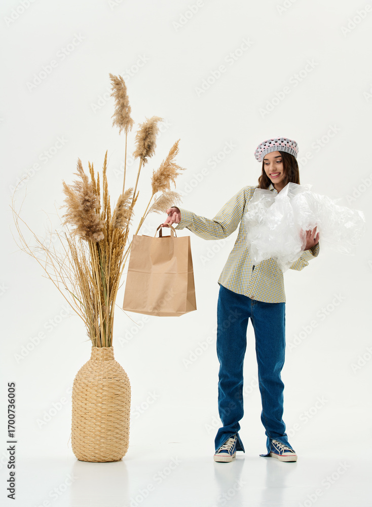 Girl model with a paper bag in her hands, shooting in a studio on a gray background.